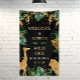 This jungle safari themed first birthday party welcome banner features gold faux foil animals (giraffe, lion and monkeys), gold and green jungle foliage, and a sprinkling of gold confetti on a black background. The words "Welcome to [child's name's] Wild One Birthday Party" appear in gold and white lettering. Customise by adding the name of the birthday boy or girl in gold text and the party date in white.