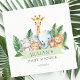 This safari adventure baby shower design showcases charming jungle animals including a hippo, giraffe, elephant, lion, monkey & tiger. Perfect for celebrating the arrival of a new bundle of joy. The vibrant colours and cute animal illustrations create a whimsical and playful atmosphere, setting the tone for a fun and memorable event. A delightful choice for any jungle-themed baby shower.
