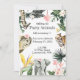 Celebrate your little one's birthday with this wild safari-themed birthday invitation. It includes watercolor animals, birds of paradise, hibiscus and greenery.