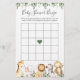 Safari animals themed baby shower bingo game card features a watercolor safari animals illustration and watercolor greenery eucalyptus garland and elegant handwritten style font.