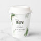Wild forest themed giraffe, and elegant boys safari animal baby shower paper cup featuring a giraffe, an elephant, gold foil and green leaves.
