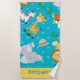 This cute kids safari themed beach towel features a nice animal design. Set against a blue polka dot background, your little one will enjoy the tigers, lions, elephants, giraffes and zebras illustrated on this towel. Best of all, there is place to insert the child's name in blue font on a yellow background. Personalise your cute beach towel today!