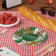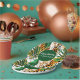 Safari-inspired paper plates featuring animal fur patterns (leopard) and rich dark green palm motifs perfect for wildlife themed parties.