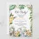 Sweet girl's safari themed baby shower invitation featuring six watercolor jungle animals, floral arrangement and some tropical foliage. This safari themed baby shower invitation is a lovely way to invite guests to a girl's safari themed baby shower.