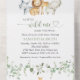 Invite friends and family in style and set the tone for your special day with this charming baby shower invitation. Design features safari animals (hippo, lion, elephant, giraffe) and greenery on white background.