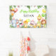 Make your child's birthday party truly magical with this kid's birthday party banner. This enchanting banner features a border of leaves, showcasing adorable wild animals wearing festive party hats, holding colourful balloons, and carrying gifts. This banner adds a playful and artistic touch to your child's birthday party with its delightful design and customisable text, creating a memorable atmosphere for all. Order now to bring joy and charm to your little one's special day!