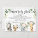 Sweet and elegant girl's safari animals baby shower invitation featuring four jungle animals, some pink floral arrangements and some foliage. This is a sweet way to invite guests to a little girl's virtual safari themed baby shower.