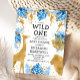 This "wild one" jungle safari themed boy's baby shower invitation features gold faux foil animals (giraffe, lion and monkeys), gold and blue jungle foliage, and a sprinkling of gold confetti on a white background. Add the name of the mum-to-be and shower details in black text.