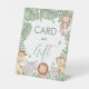 A safari-themed Cards and Gifts sign featuring watercolor jungle animals and tropical greenery. Perfect for directing guests where to place their cards and presents during the celebration. A coordinated addition to Wild One, jungle, or gender-neutral baby shower themes and matching party stationery.