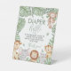A safari-themed diaper raffle sign featuring watercolor jungle animals and tropical greenery. Perfect for guiding guests to leave their raffle tickets after bringing a pack of diapers. An ideal addition to Wild One, jungle, or gender-neutral baby shower themes and coordinated party stationery.