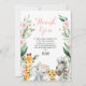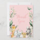 Cute girl's safari themed baby shower thank you card featuring four watercolor animals and a foliage and pink roses wreath. This safari themed invitation design is a lovely way to thank guests for attending your safari themed girl's baby shower.