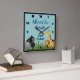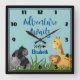 A square clock with a safari theme. A watercolor illustration with a gorilla, hippo, lion and giraffe hanging out amongst the green grasses. Typography says Adventure Awaits Cute and whimsical perfect gift for a child.