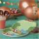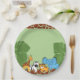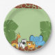 Safari theme with jungle leaves, cute a giraffe, zebra, tiger and elephant illustrations. The giraffe pattern continues through other items in this collection. Discover the complete set from our shop. Green background on the plate can be easily changed using the customisation tool. Great paper plate for a safari birthday, baby shower party.