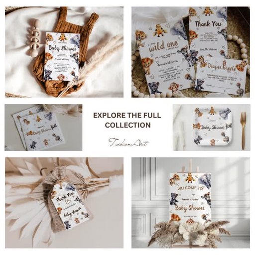 Safari Animal Baby Shower invite is a delightful ensemble featuring charming watercolor illustrations of various adorable jungle animals: giraffe, elephant, lion, tiger, ostrich, zebra, and monkey, all rendered in soft and vibrant watercolor tones. Each animal brings a touch of whimsy and playfulness to the celebration, making it perfect for a jungle-themed baby shower.