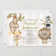 Cute safari baby shower invitations with a sweet baby lion wearing a pair of diapers with green diaper pins on it with his zebra, monkey and giraffe friends surrounding him on a striped background. This invite is perfect for a jungle themed baby shower for the mummy to be expecting a little boy. Artwork © Chrissy H. Studios, LLC. All rights reserved.