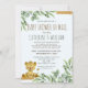 This cute jungle safari themed baby shower by mail invitation is so sweet. It's sure to make your friends and family smile when you invite them to your baby shower by mail for a baby boy or baby girl. This gender neutral design features a sweet baby lion framed by eucalyptus botanical leaves and gold trim.