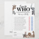 A modern wild one baby shower game featuring a simple plain white background, elegant watercolor safari animals (giraffe, elephant, lion, zebra, leopard, monkey, bee eater bird, rhino), and a "guess who, mummy or daddy" template that is easy to personalise.