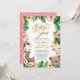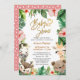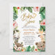 Jungle Safari Animal Tropical Floral Greenery Gold Script Cute Baby Shower Invitation Card. Celebrate the upcoming arrival of your precious baby with this festive, chic and beautiful Invitation card. All the texts are pre-arranged for you to personalise easily and quickly with your baby shower details.