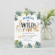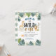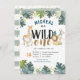 Wild One Safari Birthday invitation with wild animals, lion, monkey, elephant, and Giraffe
