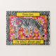 Sweet safari style puzzle game. The zebra is wearing a heart on it's hind quarters that says "LOVE" and is grazing among a field of mod pink and yellow flowers. The remainder of the background consists of psychedelic zebra stripes. The floral art is goldenrod, sunshine yellow, blush pink, and fuchsia. There is a name template above the zebra and another below. The bottom text reads: I'm WILD about you! The text is easily changed to your liking. Surprise your Valentine sweetheart with this fun colourful novelty.