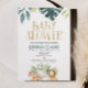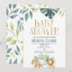 This is a safari zoo jungle animal themed baby shower invite. The design includes a tiger, elephant, and lion. Leaves/Greenery design.