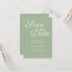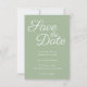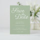 The Save the Date typography text is a lovely contemporary elegant calligraphy style in white against solid sage.