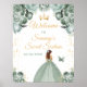 This elegant and glamourous sweet sixteen welcome sign features a beautiful princess with brown hair in a sage green ball gown. The text combines handwritten script and modern sans serif fonts for a classy and sophisticated look. The floral arrangements, butterfly and gold confetti create the perfect blend of rustic and chic.