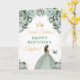 This elegant and glamourous sweet sixteen birthday card can be personalised with a name or title such as daughter, granddaughter, niece, friend etc. The design features a beautiful princess with brunette hair in a sage green ball gown. The text combines handwritten script and modern sans serif fonts for a classy and sophisticated look. The floral arrangements, butterfly and gold confetti create the perfect blend of rustic and chic. Graphics by www.etsy.com/uk/shop/SunflowerDayLove