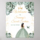 This elegant and glamourous sweet sixteen welcome sign features a beautiful princess with brunette hair in a sage green ball gown. The text combines handwritten script and modern sans serif fonts for a classy and sophisticated look. The floral arrangements, butterfly and gold confetti create the perfect blend of rustic and chic.