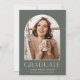 Elegant photo graduation announcement features a vertical or portrait orientated photo in a unique arched layout, on a dark sage green background. "Graduate" appears beneath, along with your graduate's name and school or college. Add a personal message to the back, along with an additional photo.