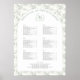 Modern elegant seating chart sign with arch sage green and toile background. Couple's initials framed in top of arch. Guests names grouped alphabetically according to last name of guests, can group dates together to save room. Head table listed at bottom.