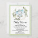Watercolor elephant in sage green and grey surrounded by gold-look geometric prism with eucalyptus foliage over sage green polka-dot background baby shower invitation card design.