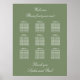 Sage Green 9 Table Wedding Seating Chart Poster, please personalise the names of the couple and the names of the guests along with any of the other text that you may wish to personalise. A stylish seating chart poster featuring elegant white text on a lovely sage green background.