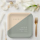 These sage green and cream minimalist, elegant, monogrammed wedding paper plates can be personalised with your information in modern typography. Designed by Thisisnotme©