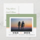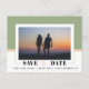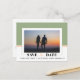 Sage green and peach colour block wedding Save the Date photo postcard. The upper of this Save the Date design is of sage green colour colour with a peach stripe while the bottom is of white with the text. It also features a photo of the couple.