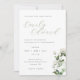 Custom-designed wedding invitation card featuring delicate calligraphy with elegant sage greenery and white floral design.