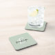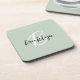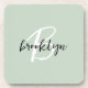 This elegant personalised coaster features a monogram and first name in modern black and white script on a sage green background.