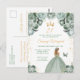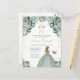 This elegant and glamourous birthday party invitation features a beautiful princess with blonde hair in a sage green ball gown. The text combines handwritten script and modern sans serif fonts for a classy and sophisticated look. The floral arrangements, butterfly and gold confetti create the perfect blend of rustic and chic.