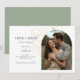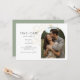 These modern minimalist wedding save the date flat cards feature a boho arch couple photo, delicate imitation gold floral elements and a contemporarty set of fonts in jet black. Flower detail is repeated at the back against a sage green background. This design is contemporary and chic. Perfect for the stylish and elegant couple.
