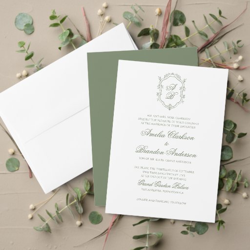 Deep Sage Green Botanical Monogram Crest WeddingDesigned by Jessica Senarlo