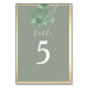 Elegant sage green wedding table number card with watercolor eucalyptus leaves and minimalist calligraphy. Perfect for nature-inspired weddings, this design pairs beautifully with modern boho or rustic receptions.