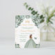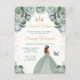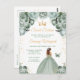 This elegant and glamourous sweet sixteen birthday invitation features a beautiful princess with brown hair in a sage green ball gown. The text combines handwritten script and modern sans serif fonts for a classy and sophisticated look. The floral arrangements, butterfly and gold confetti create the perfect blend of rustic and chic.