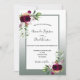 On front: Sage green gradient with a sage green and white frame. Decorated with flowers, roses in burgundy with greenery. Templates for Your names and wedding details. The names are written with a hand lettered style script, black coloured letters.