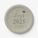 Simple and elegant graduation party plate featuring typography text that says "class of 2025" in script font with a graduation cap illustration. The background is sage green.