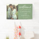 This simple solid sage green wedding banner features elegant white script and your couple engagement photo for an outdoor ceremony in a nature setting. Minimalist typography on peaceful light green decor for a rustic venue outside near a forest of trees.