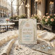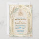 Celebrate your union with a sophisticated blend of tradition and modern artistry, featuring soft sage foliage, dusty blue accents, and an elegant Nikkah layout.This design features a formal composition centered around a geometric Islamic archway with intricate Moroccan lattice detailing inside the columns. A graceful "Bismillah" in Arabic calligraphy sits at the apex, grounding the design in tradition. The arch is framed by watercolor botanical elements, including white roses, eucalyptus leaves, and swaying pampas grass plumes in soft sage and cream tones. The text hierarchy utilizes a deep brown decorative serif font paired with an elegant script for names, set against a clean ivory background.This is a flat printed image with a printed gold effect, not actual raised foil or metallic material.