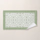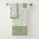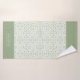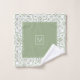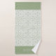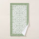 Sage green and white damask pattern and scalloped borders Bath Towel Set. The bath towel features an elegant green and white damask pattern and bands on the short sides with scalloped edges. There is also a frame with your family name. The hand towel showcases a scalloped border around it while the wash cloth is in sage green colour in the centre with a damask border and your monogram. You can personalise it with your family name and monogram.