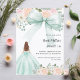 A white background, decorated with a large sage green coloured bow, pink flowers and a girl in a green coloured dress. Personalise and add a name and party details.