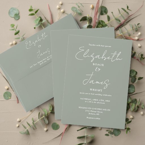 Simple Sage Green Script Wedding Invitation SuiteDesigned by Pure Piglet Designs