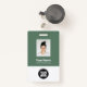 Easily personalise this Black and White Custom Employee Name Badge with Photo, Scan Bar Code and business logo. A simple business design in dark sage green and white standard colours fully customisable in front and back sizes, sans-serif basic and modern fonts and a professional and clear look. Avaiable with lanyard, metal clip or with retractable. No minimum order.